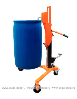 Ручная механическая тележка для перевозки бочек г/п 350 кг. Отличается высокой маневренностью и компактностью за счет особенности конструкции: оборудование имеет 3 устойчивых колеса диаметром 150 мм и поворотное колесо 125 мм. Бочка фиксируется специальным захватом, а затем с помощью рычага гидроузла поднимается на высоту до 300 мм.
